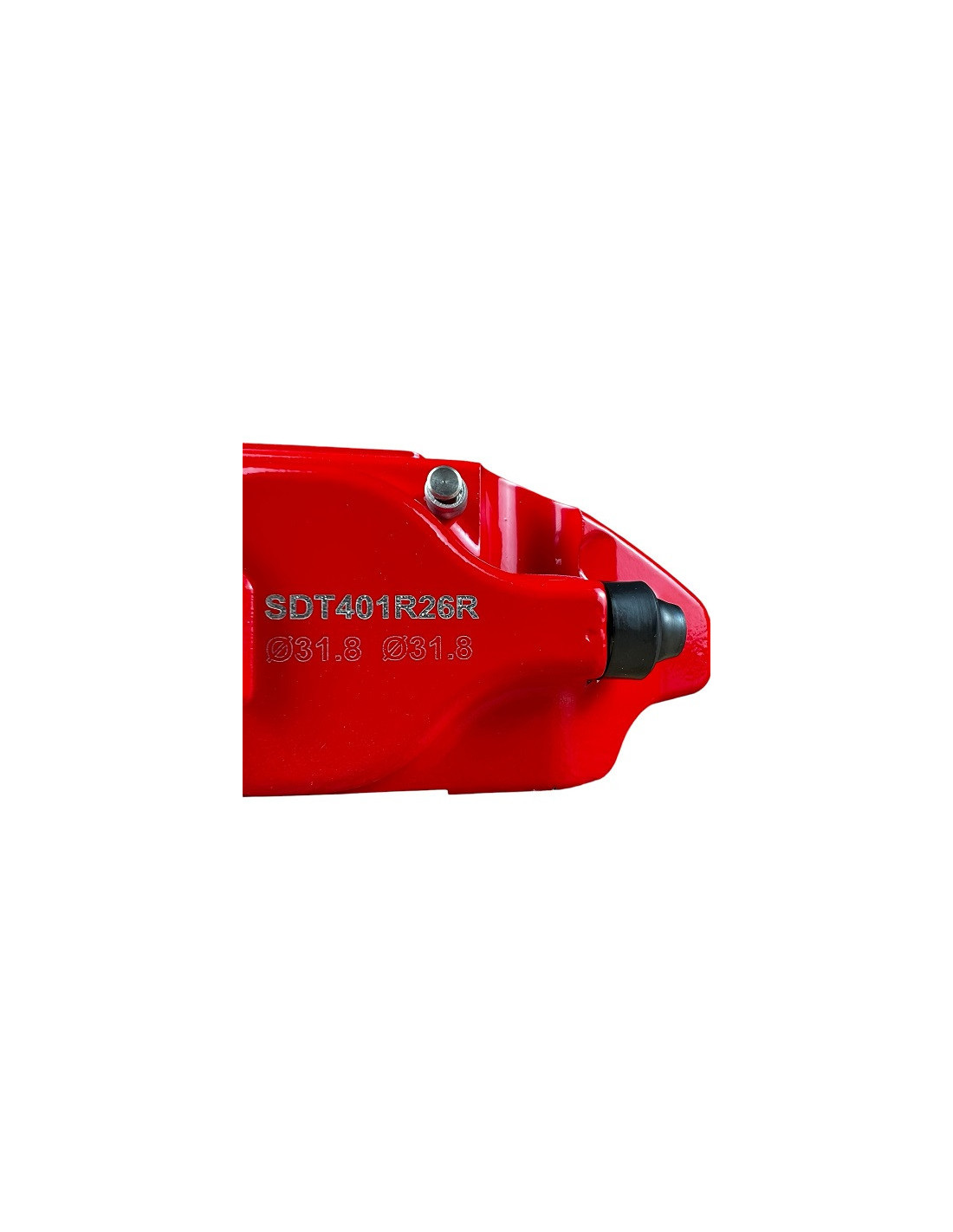 Red SDT 4-piston brake caliper for use on the front axle (Right side) on track days, circuits, and rally in lightweight vehicles. Radial mounting (130mm), compatible with discs of Ø280, 282, 286, 288, 290, and 295mm, with a minimum thickness of 24mm and a maximum of 25mm.
