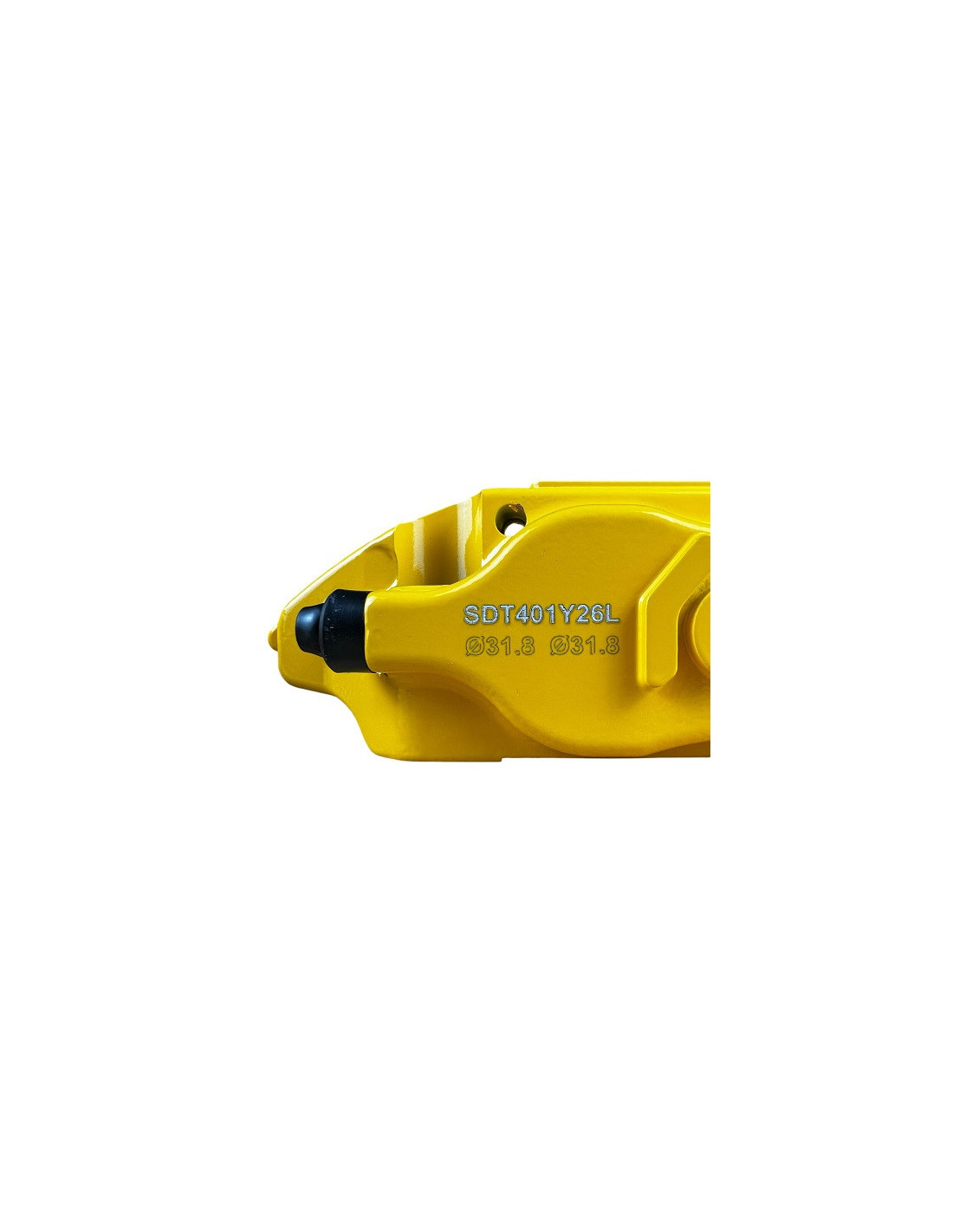 Pinza de freno SDT amarilla de 4 pistones para uso en eje delantero (lado izquierdo) en trackday, circuito y rallye en vehiculo lígero. Montaje radial (130mm), compatible con discos de Ø280, 282, 286, 288, 290 y 295mm y con grosor min. 24mm y máximo 25mm.
